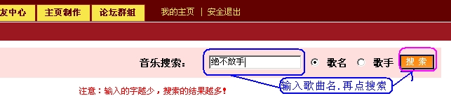 MP3音乐地址的攫取操作如下: 我示范:插入"绝不放手"歌曲.当然你可以按这个方法.插入千千万万首的不同各个歌曲.