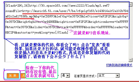 把复制好的MP3音乐地址插入到代码:[这几个字是多余的.请复制好再删除掉这几个字flash=290,24]http://30.space163.com//awei2222/flash/mp3.swf?soundFile=MP3音乐地址&bg=0xCDDFF3&leftbg=0x357DCE&lefticon=0xF2F2F2&rightbg=0x357DCE&rightbghover=0x4499EE&righticon=0xF2F2F2&righticonhover=0xFFFFFF&text=0x357DCE&slider=0x357DCE&track=0xFFFFFF&border=0xFFFFFF&loader=0x8EC2F4&autostart=yes&loop=yes[/flash]中.将MP3音乐地址换成你复制来的这个音乐地址.然后再删除掉这几个字是多余的.请复制好再删除掉这几个字就可以了.记得了.代码不要弄乱了.否则将显示不出来的.然后你可以请整个代码放在你的日志或者发帖子中都可以.简单吧! 发表在日志中操作如图: